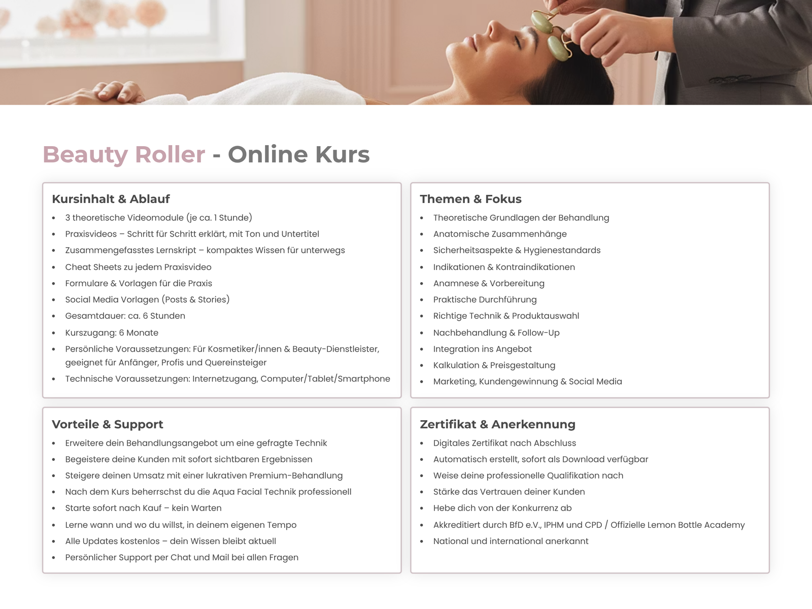 Mit unserem Online Kurs eignest du dir das komplette Fachwissen zur Beauty Roller-Anwendung an. Lerne die richtige Rolltechnik, verschiedene Gesichtszonen und worauf es in der Praxis wirklich ankommt – alles verständlich erklärt und sofort anwendbar.