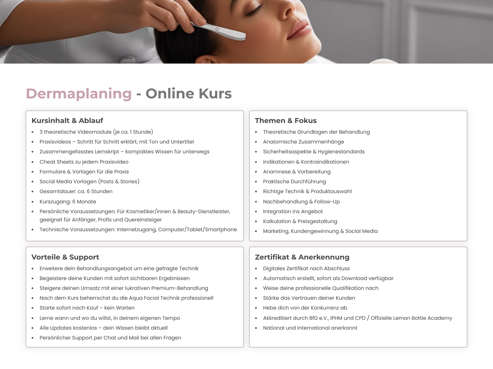 Mit unserem Online Kurs eignest du dir das komplette Fachwissen zur Dermaplaning-Behandlung an. Lerne die richtige Klingentechnik, wichtige Hygiene-Standards und worauf es in der Praxis wirklich ankommt – alles verständlich erklärt und sofort anwendbar.