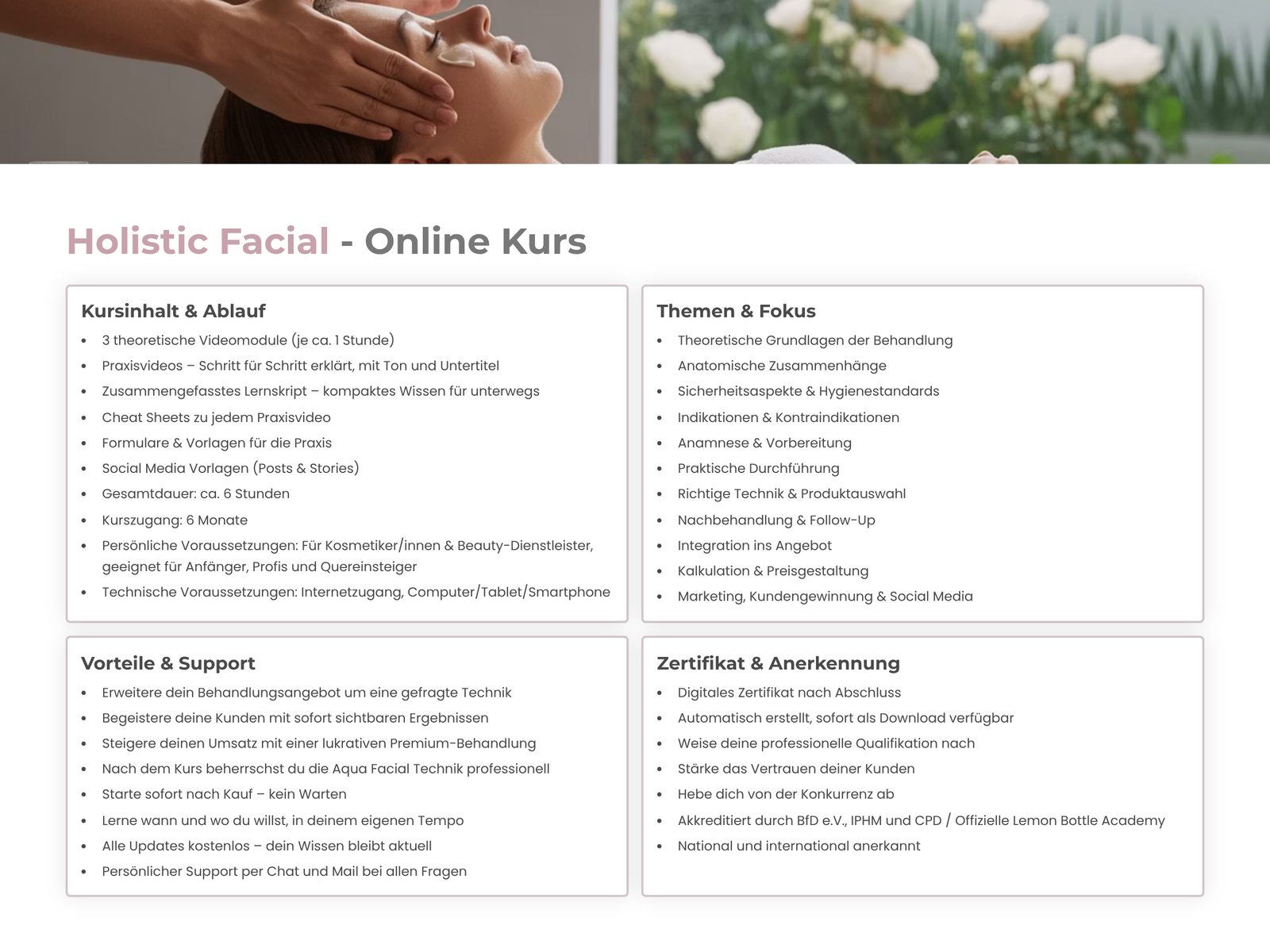 Mit unserem Online Kurs eignest du dir das komplette Fachwissen zur Holistic Beauty Facial-Behandlung an. Lerne die richtige ganzheitliche Technik, Energie-Arbeit und worauf es in der Praxis wirklich ankommt – alles verständlich erklärt und sofort anwendbar.