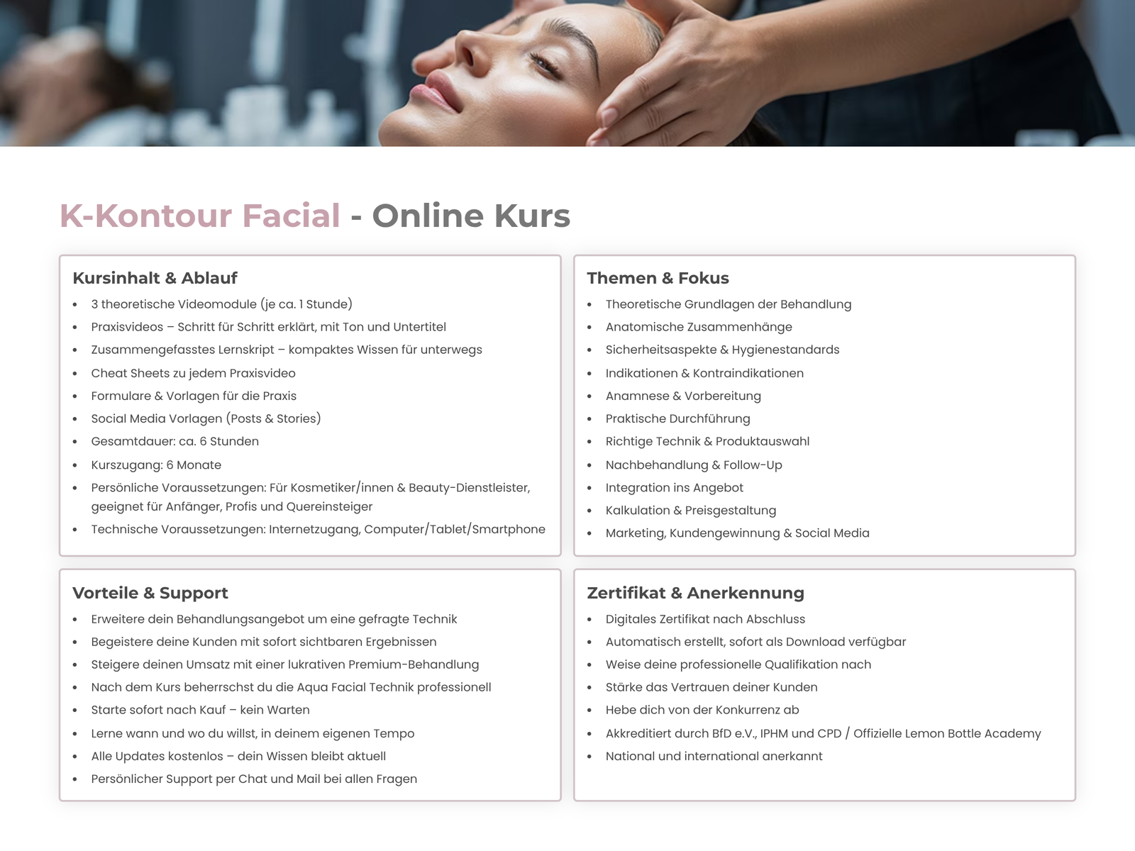 Mit unserem Online Kurs eignest du dir das komplette Fachwissen zur K-Kontour Facial-Behandlung an. Lerne die richtige Konturierungstechnik, Gesichtsmodellierung und worauf es in der Praxis wirklich ankommt – alles verständlich erklärt und sofort anwendbar.