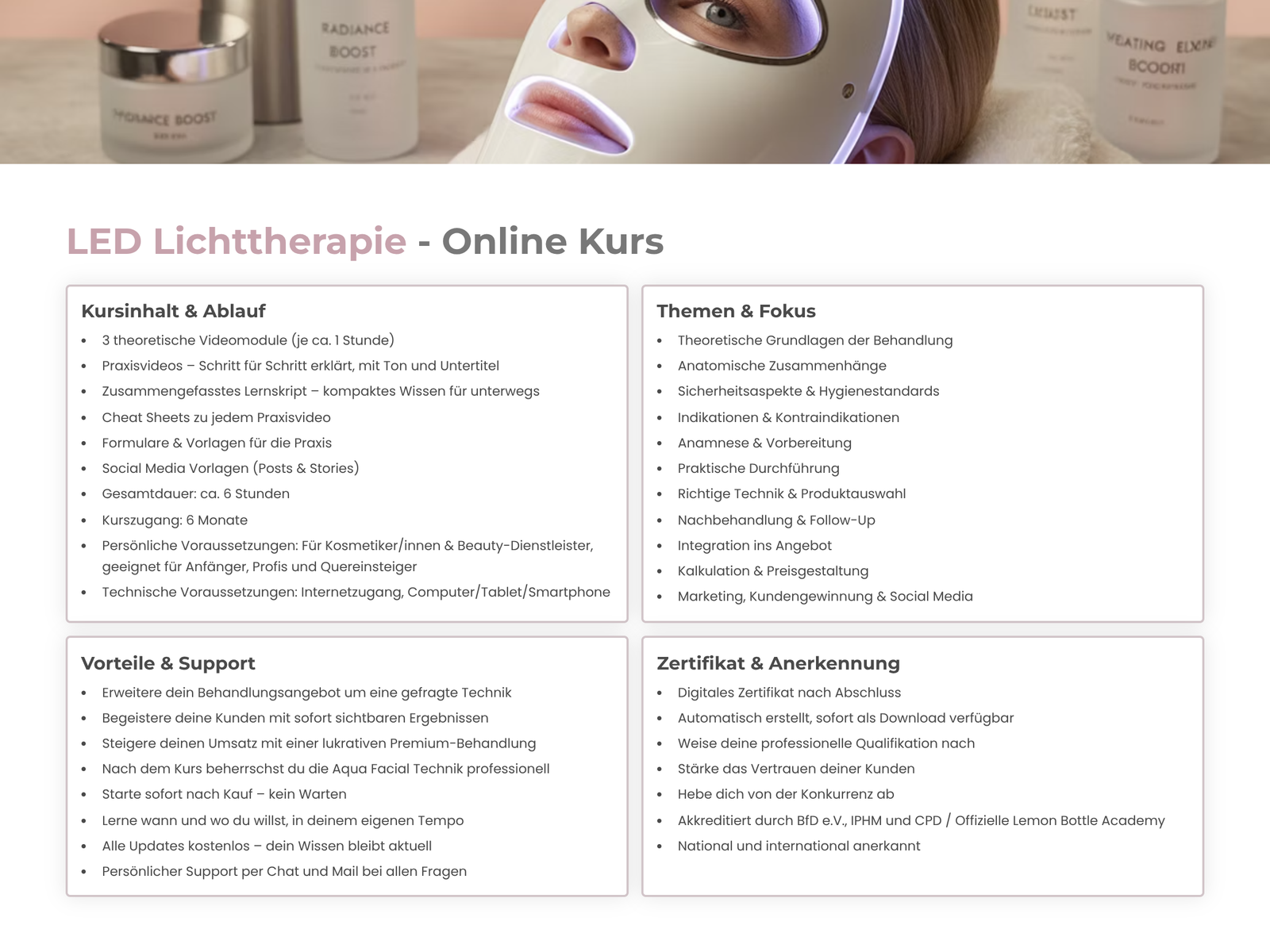 Mit unserem Online Kurs eignest du dir das komplette Fachwissen zur LED Lichttherapie-Behandlung an. Lerne die richtige Anwendung verschiedener Lichtfarben, Behandlungsprotokolle und worauf es in der Praxis wirklich ankommt – alles verständlich erklärt und sofort anwendbar.