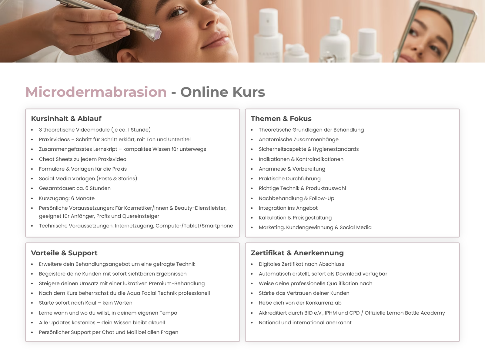 Mit unserem Online Kurs eignest du dir das komplette Fachwissen zur Microdermabrasion-Behandlung an. Lerne die richtige Gerätetechnik, verschiedene Intensitätsstufen und worauf es in der Praxis wirklich ankommt – alles verständlich erklärt und sofort anwendbar.