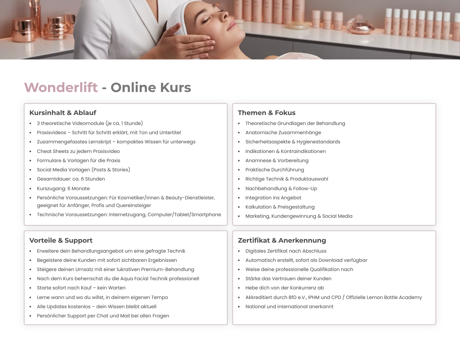 Mit unserem Online Kurs eignest du dir das komplette Fachwissen zur Wonderlift-Behandlung an. Lerne die richtige Lifting-Technik, Fadenmethoden und worauf es in der Praxis wirklich ankommt – alles verständlich erklärt und sofort anwendbar.