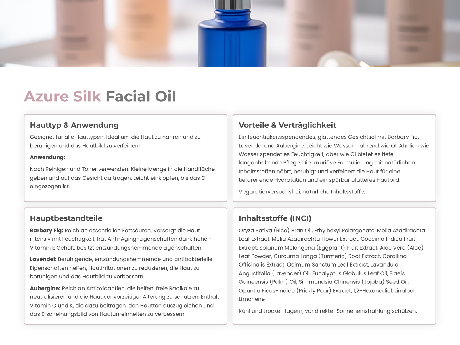 Das Azure Silk Facial Oil vereint luxuriöse und natürliche Inhaltsstoffe, die die Haut nähren, beruhigen und verfeinern. Dieses Gesichtsöl ist perfekt für alle, die eine tiefgreifende Hydratation und eine spürbar glattere Haut anstreben. Leicht wie Wasser, nährend wie Öl – ähnlich wie Wasser spendet es Feuchtigkeit, aber wie Öl bietet es tiefe, langanhaltende Pflege. Die Kombination aus Barbary Fig, Lavender und Eggplant macht das Azure Silk Facial Oil zu einer perfekten Ergänzung für jede Hautpflegeroutine, die den Teint verfeinern, beruhigen und intensiv hydratisieren möchte. Das Hautbild verbessert sich sichtbar und die Haut zeigt sich jeden Tag von ihrer besten Seite.