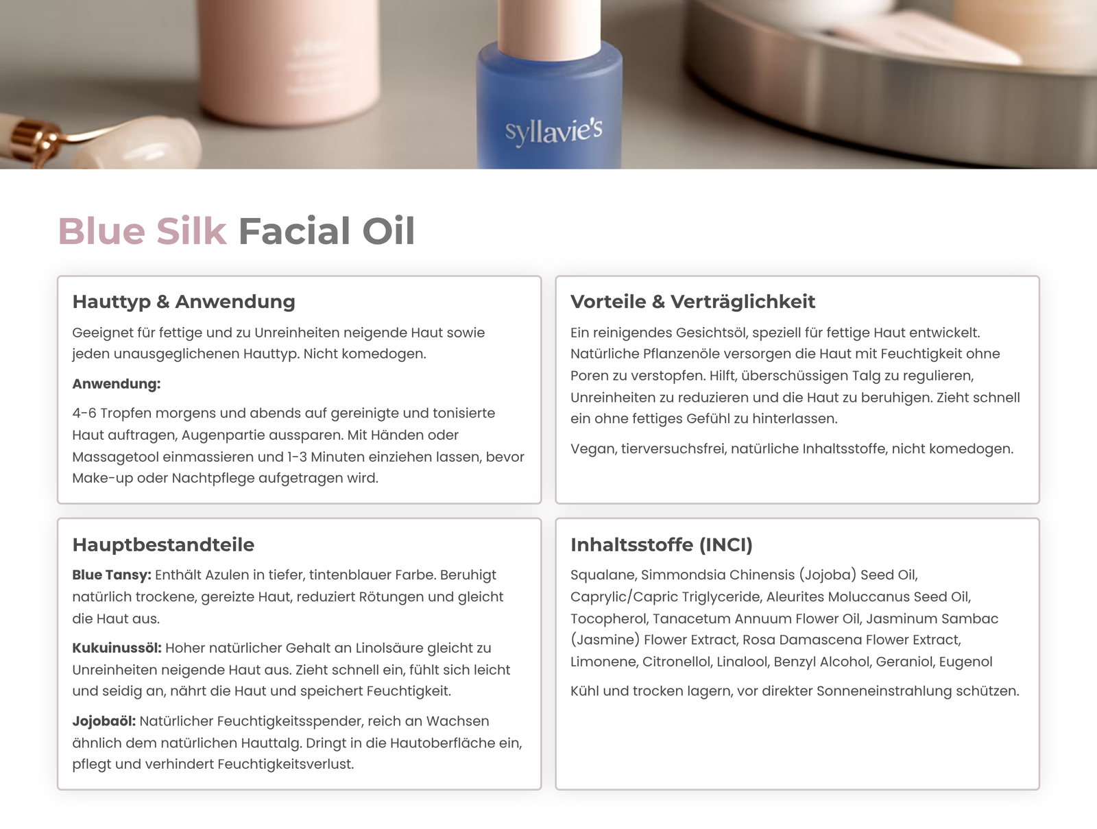 Die luxuriöse Pflege des Blue Silk Purifying Facial Oil wurde speziell entwickelt, um die Haut zu reinigen, zu beruhigen und intensiv zu nähren. Diese hochwirksame Mischung aus natürlichen, veganen und tierversuchsfreien Inhaltsstoffen ist ideal für alle Hauttypen, insbesondere für unreine und zu Akne neigende Haut. Das reinigende Gesichtsöl hilft, überschüssigen Talg zu regulieren, Unreinheiten zu reduzieren und die Haut zu beruhigen. Die sorgfältig ausgewählten natürlichen Pflanzenöle versorgen die Haut mit Feuchtigkeit, ohne die Poren zu verstopfen. Das Öl zieht schnell ein, ohne ein fettiges Gefühl zu hinterlassen, und ist die perfekte Ergänzung jeder Hautpflegeroutine.