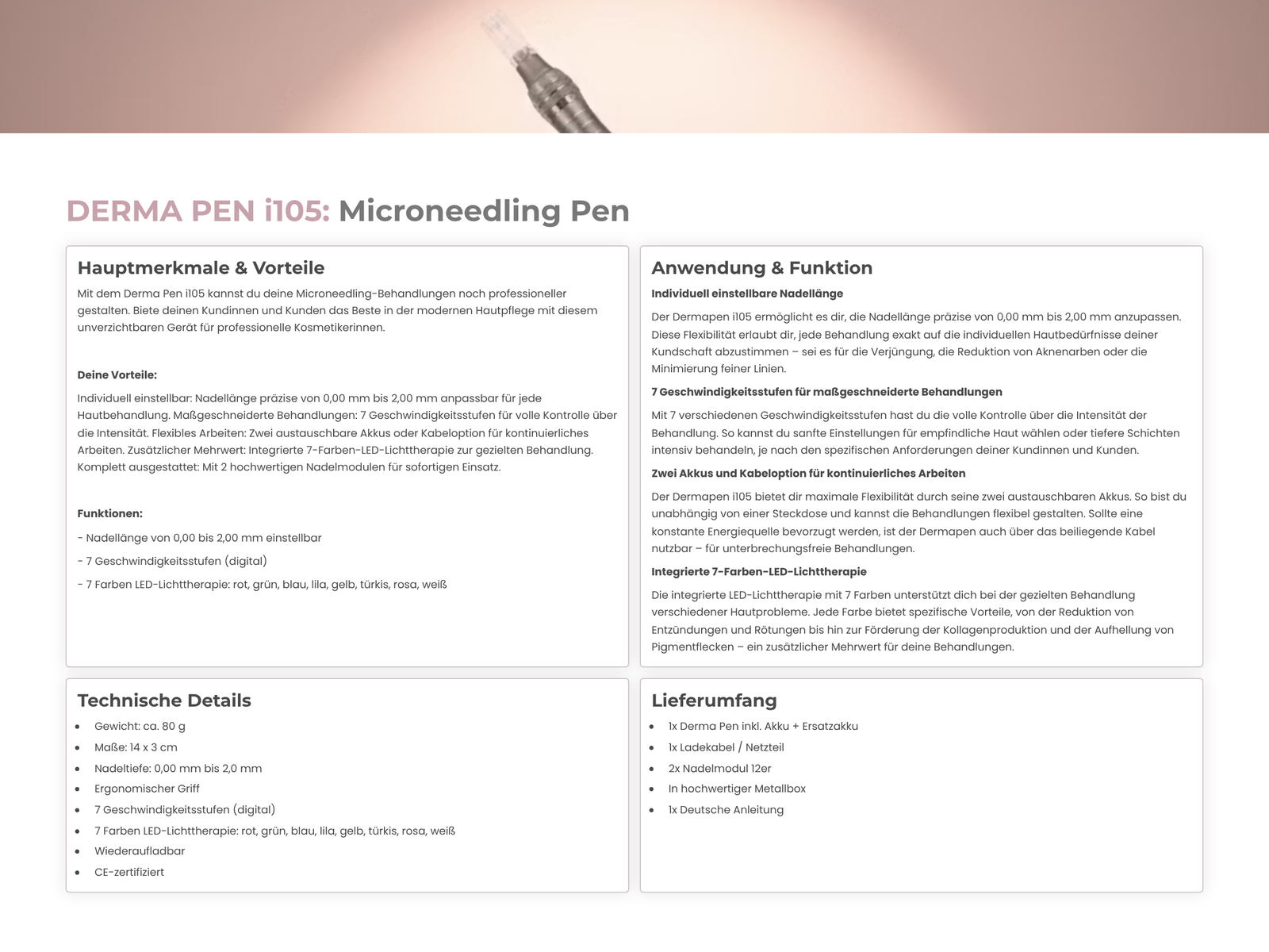 Der DERMA PEN i105 bietet präzise einstellbare Nadellängen von 0,00mm bis 2,00mm und 7 Geschwindigkeitsstufen für maßgeschneiderte Microneedling-Behandlungen. Mit 2 Akkus, integrierter LED-Lichttherapie und 2 Nadelmodulen sofort einsatzbereit.