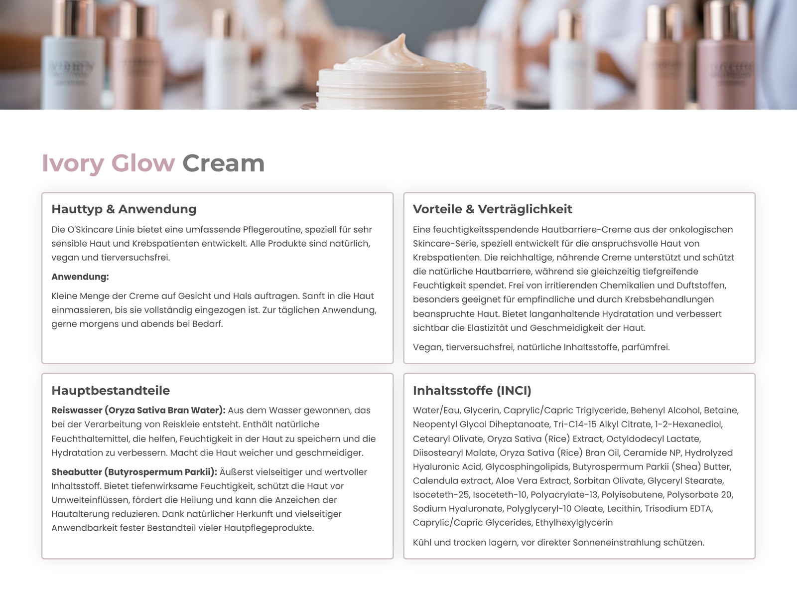 Die Ivory Glow Cream aus der onkologischen Skincare-Serie wurde speziell entwickelt, um die anspruchsvolle Haut von Krebspatienten intensiv zu pflegen und zu stärken. Diese reichhaltige, nährende Creme unterstützt und schützt die natürliche Hautbarriere, während sie gleichzeitig tiefgreifende Feuchtigkeit spendet. Die Ivory Glow Gesichtscreme enthält eine Vielzahl von Inhaltsstoffen, die dazu beitragen, die Haut zu beruhigen, zu hydratisieren und zu schützen. Die Ivory Glow Cream ist frei von irritierenden Chemikalien und Duftstoffen, was sie besonders geeignet für empfindliche und durch Krebsbehandlungen beanspruchte Haut macht. Sie bietet eine langanhaltende Hydratation und verbessert sichtbar die Elastizität und Geschmeidigkeit der Haut.