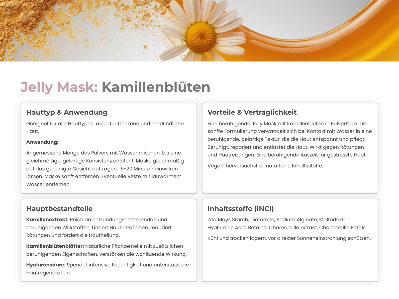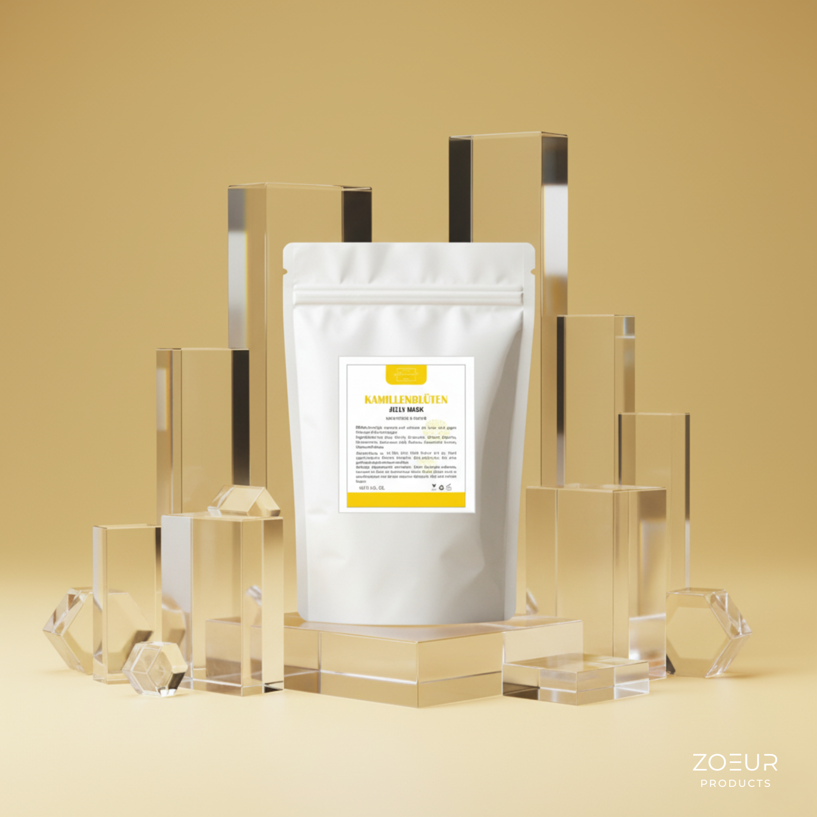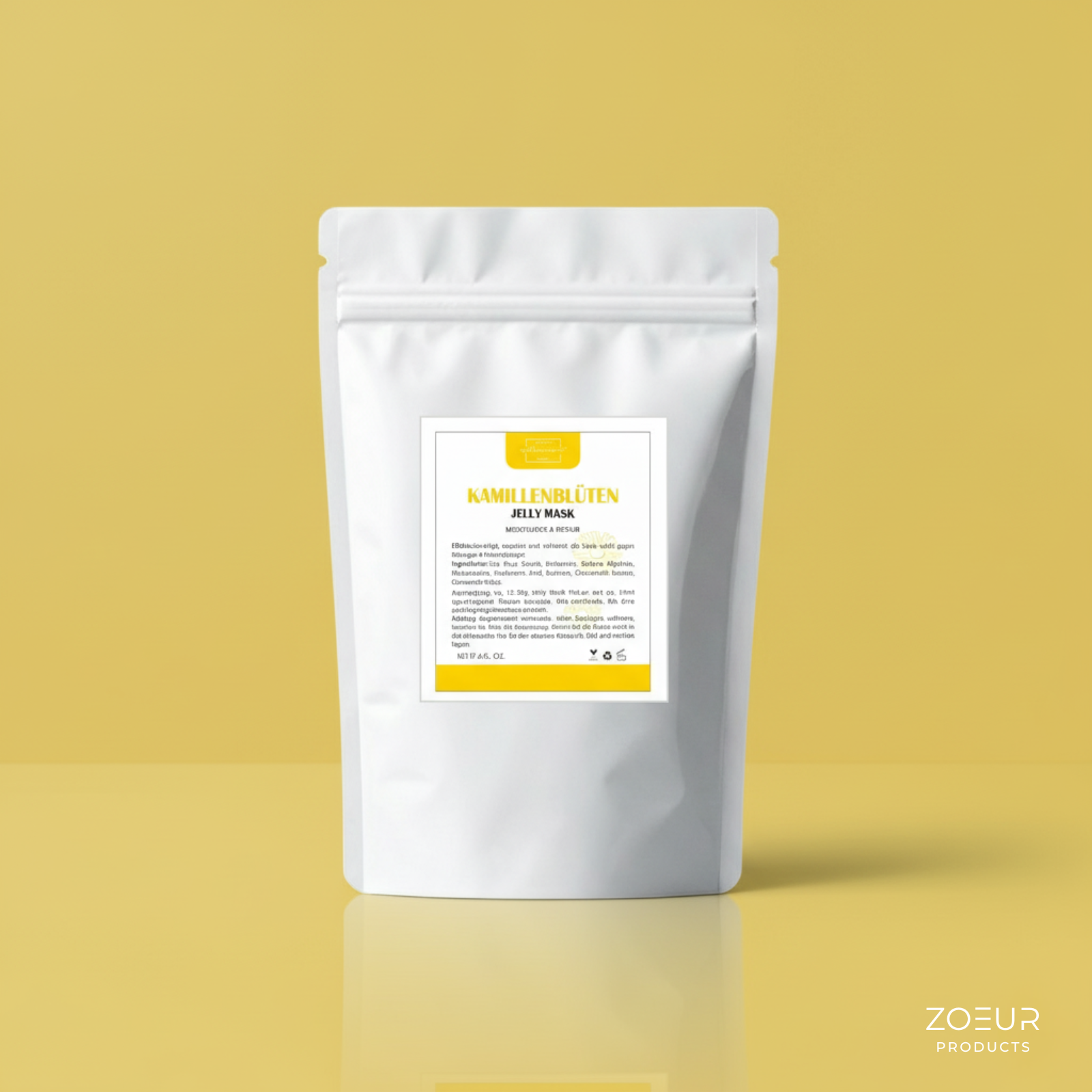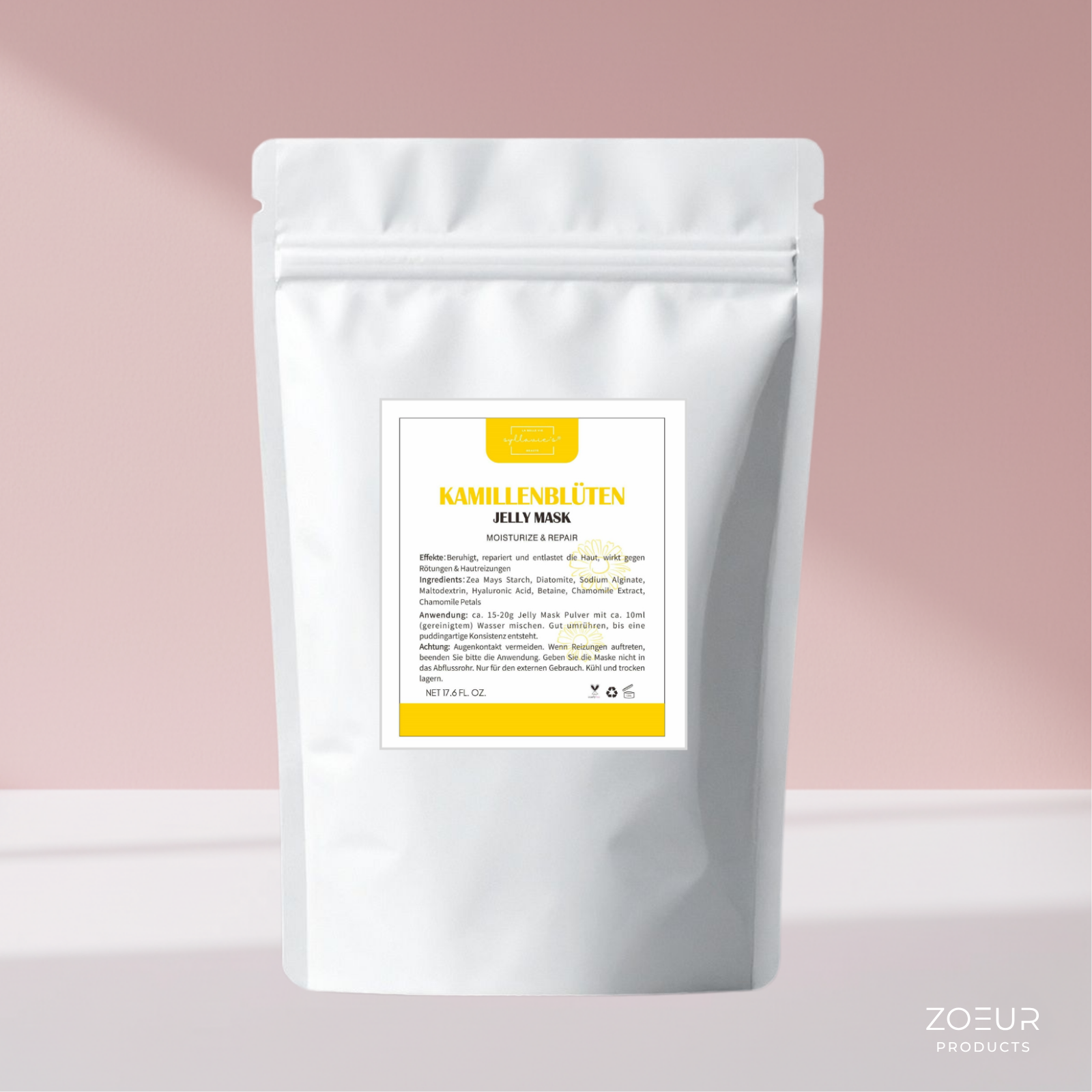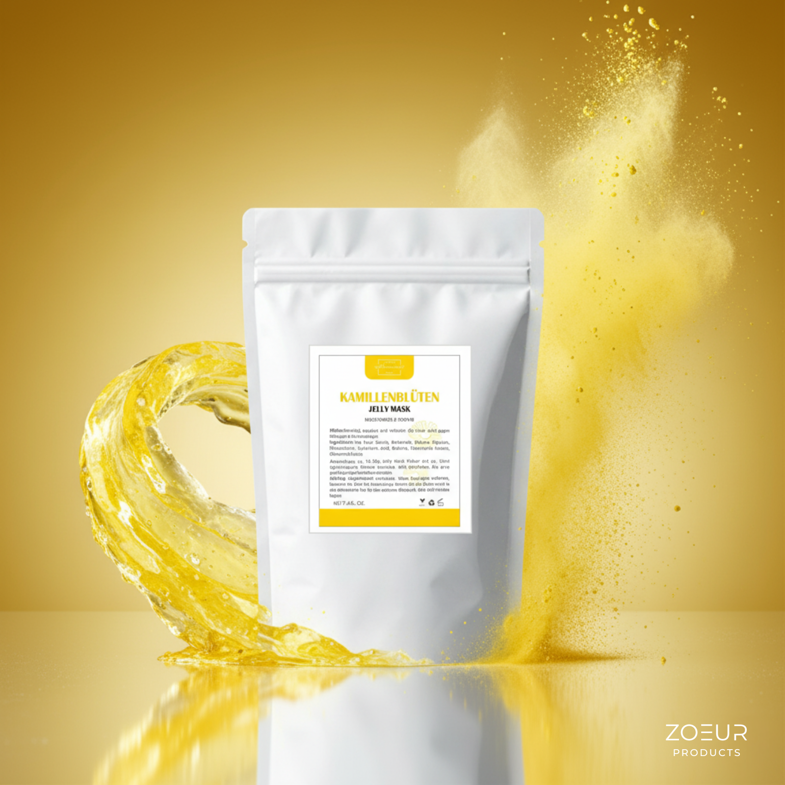 Eine beruhigende Auszeit für die Haut mit der Jelly Mask Kamillenblüten. Diese sanfte Maske in Pulverform verwandelt sich bei Kontakt mit Wasser in eine beruhigende, gelartige Textur, die die Haut entspannt und pflegt. Die natürlichen Inhaltsstoffe der Kamille wirken entzündungshemmend und beruhigend, ideal für empfindliche oder gereizte Haut. Die Kamillenblüten Jelly Mask ist perfekt für Behandlungen, die Entspannung und Regeneration in den Vordergrund stellen. Die sanfte Gel-Textur umhüllt die Haut wie ein beruhigender Balsam und hinterlässt ein angenehm entspanntes Hautgefühl.