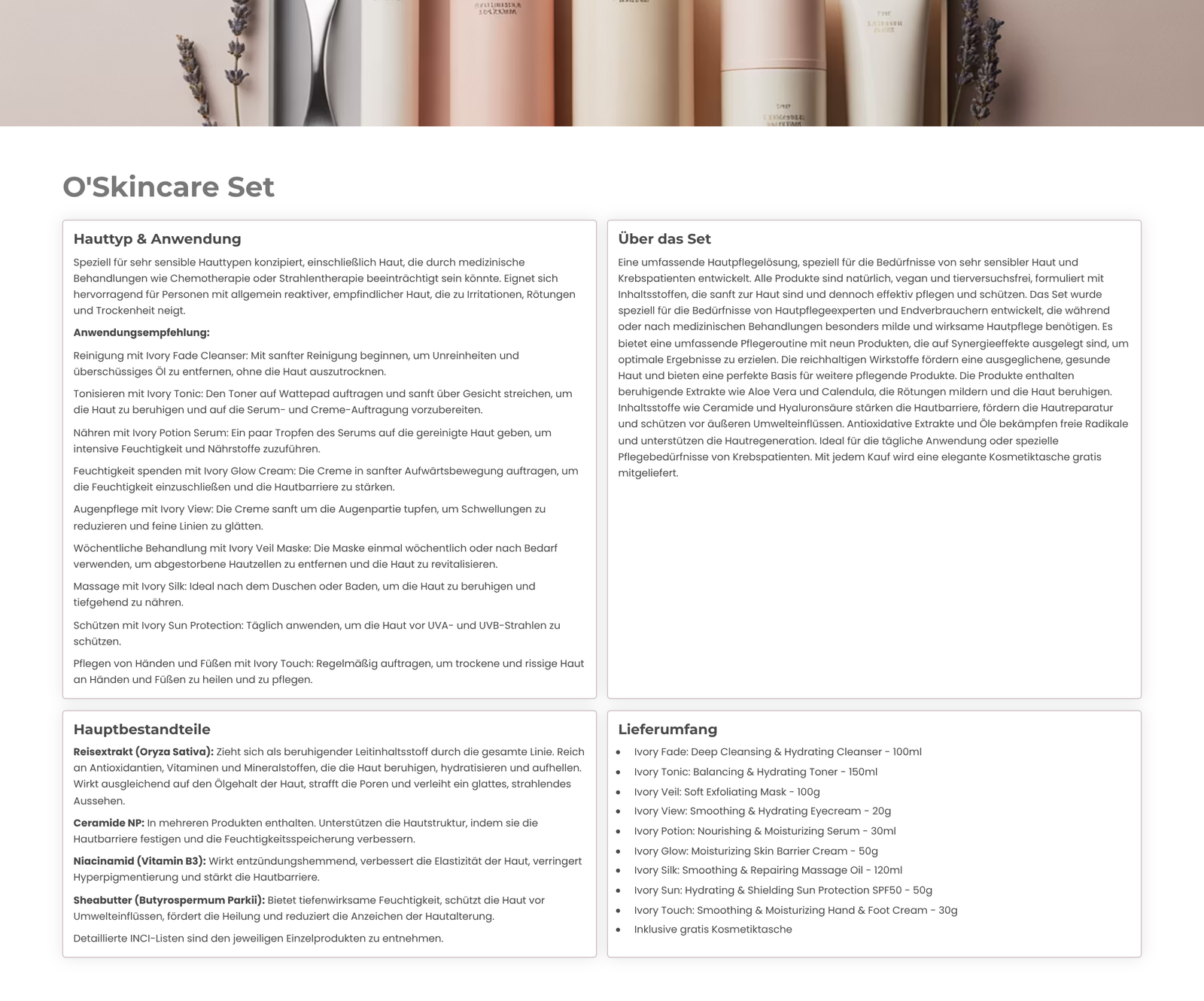 Das O'Skincare Pflegeset ist eine umfassende Hautpflegelösung, die speziell für die besonderen Bedürfnisse von sehr sensibler und durch Krebsbehandlungen beanspruchter Haut entwickelt wurde. Die gesamte Ivory Line ist frei von harten Chemikalien, Parabenen, Sulfaten, irritierenden Duftstoffen und basiert auf sanften, beruhigenden Wirkstoffen wie Rice Extract, Hyaluronsäure und Ceramiden. Alle Produkte sind natürlich, vegan und tierversuchsfrei. Das Set eignet sich ideal für Krebspatienten während und nach onkologischen Behandlungen sowie für alle mit hypersensibeler, gereizter oder stark beanspruchter Haut. Die milde Pflegeroutine reinigt sanft, beruhigt Irritationen, stärkt die Hautbarriere und spendet intensive Feuchtigkeit ohne jegliche Belastung. Perfekt für spezialisierte Kosmetikbehandlungen oder die schonende Heimpflege bei höchsten Ansprüchen an Verträglichkeit.