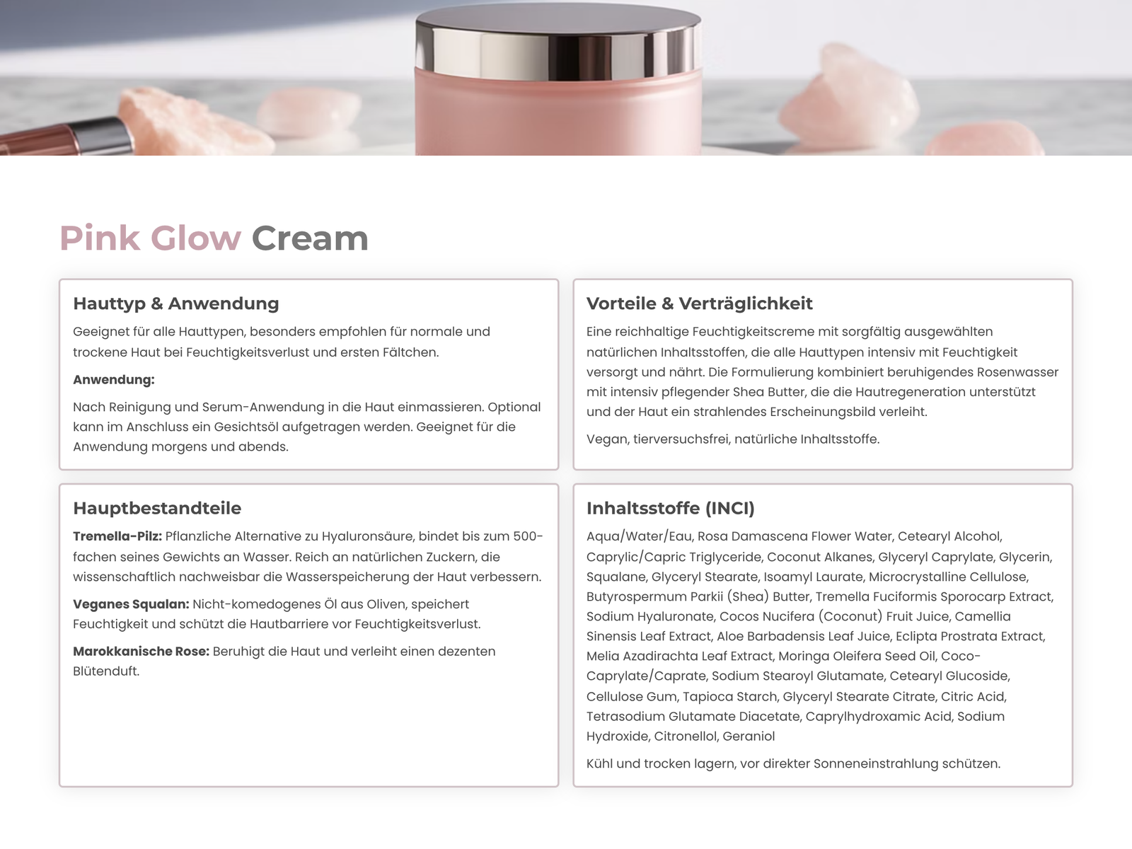 Diese reichhaltige Creme ist mit sorgfältig ausgewählten, natürlichen Inhaltsstoffen formuliert, um alle Hauttypen intensiv mit Feuchtigkeit zu versorgen und zu nähren. Rosa Damascena Flower Water beruhigt die Haut und verleiht ihr einen natürlichen, frischen Duft. Shea Butter spendet intensive Feuchtigkeit und unterstützt die Hautregeneration nachhaltig. Die luxuriöse Textur zieht tief in die Haut ein und hinterlässt ein geschmeidiges, strahlendes Hautgefühl. Die Pink Glow Cream eignet sich perfekt als abschließender Schritt der Pflegeroutine und versorgt die Haut langanhaltend mit Nährstoffen.