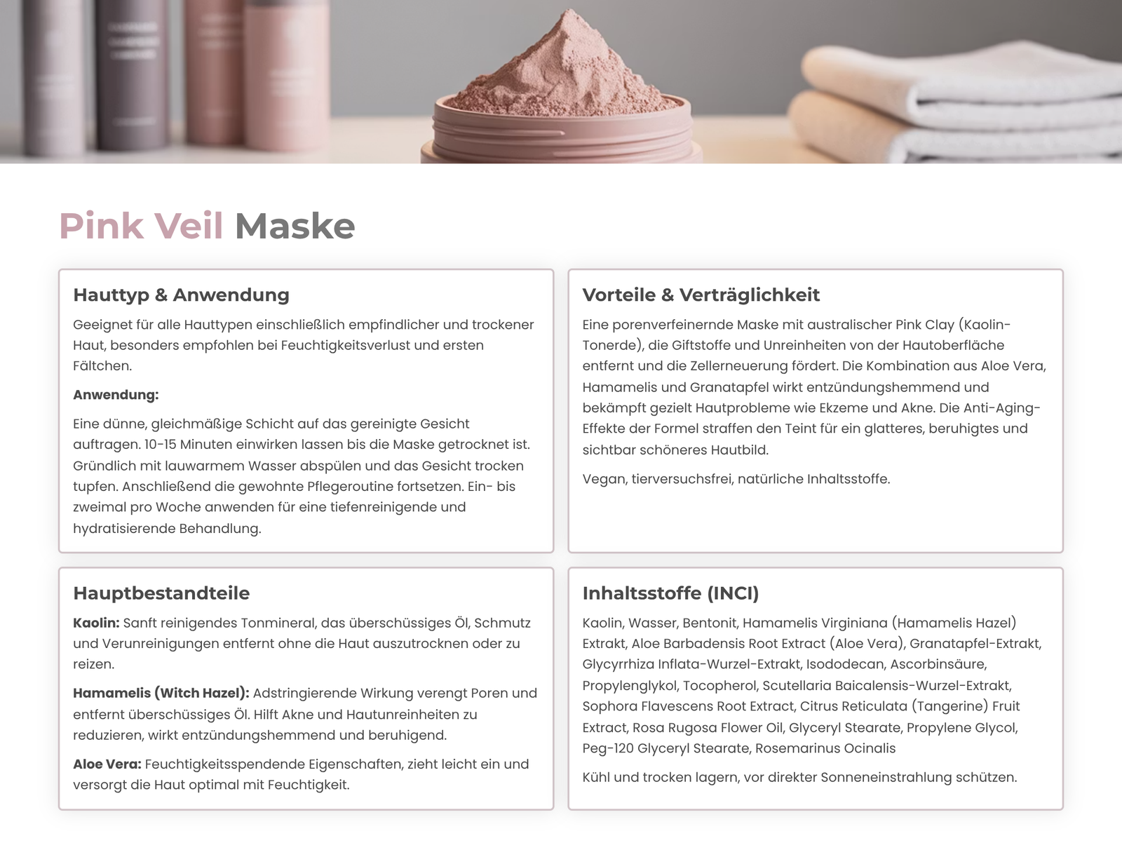Die Pink Veil Maske enthält Kaolin-Tonerde, die dazu beiträgt, Giftstoffe und Unreinheiten von der Hautoberfläche zu entfernen und die Zellerneuerung für eine neue Haut zu fördern. Die ausgewogene Mischung aus Aloe Vera, Hamamelis und Granatapfel wirkt entzündungshemmend und geht gezielt gegen Hautprobleme wie Ekzeme und Akne vor. Die Anti-Aging-Effekte der Formel straffen den Teint nachhaltig. Nach der Anwendung ist die Haut glatter, beruhigt und sieht sichtbar schöner aus. Die sanfte Formulierung macht die Maske ideal für den Einsatz auch bei empfindlichster Haut.