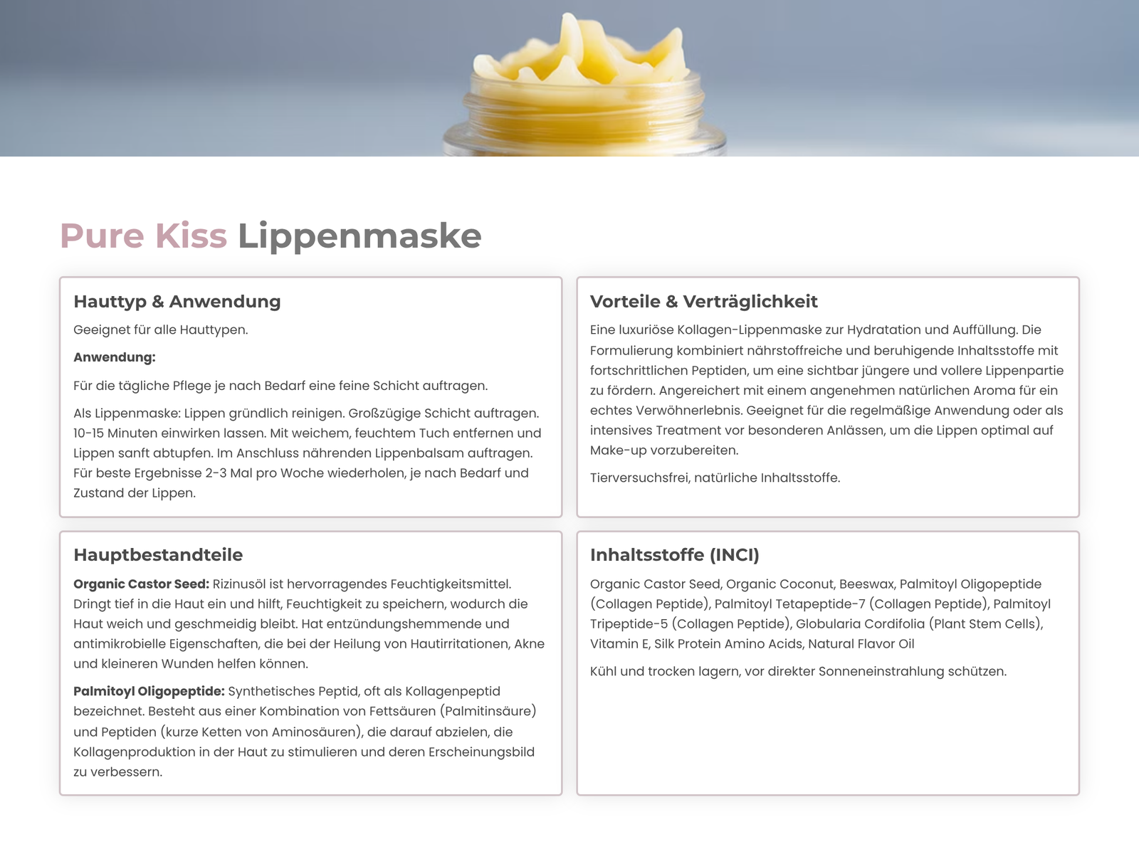 Die Pure Kiss Lippenmaske ist eine luxuriöse Behandlung, speziell entwickelt, um die Lippen zu glätten, intensiv zu hydratisieren und aufzufüllen. Diese hochwirksame Maske kombiniert naturbasierte Inhaltsstoffe mit fortschrittlichen Peptiden, um eine sichtbar jüngere und vollere Lippenpartie zu fördern. Die Formel ist angereichert mit einem angenehmen natürlichen Aroma, das die Anwendung zu einem echten Verwöhnerlebnis macht. Pure Kiss verwöhnt die Lippen mit intensiver Feuchtigkeit und einem natürlichen Fülleffekt. Geeignet für die regelmäßige Anwendung oder als intensives Treatment vor besonderen Anlässen, um die Lippen optimal auf Make-up vorzubereiten.