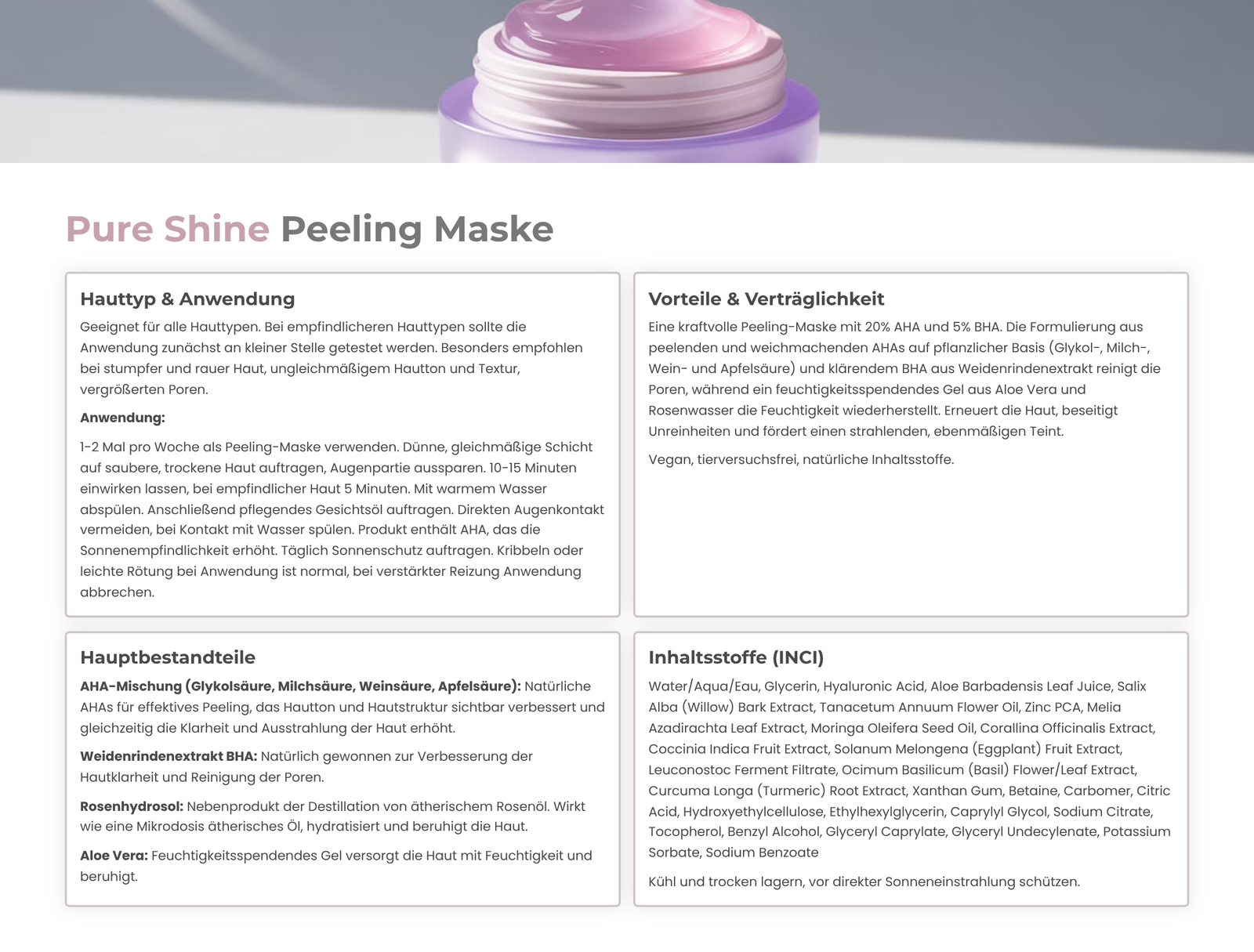 Die Pure Shine Peeling Maske erneuert und revitalisiert die Haut mit einer kraftvollen Mischung aus Alpha-Hydroxysäuren (AHA) und Beta-Hydroxysäuren (BHA). Diese vegane und tierversuchsfreie Formel ist speziell entwickelt, um die Haut zu peelen, Unreinheiten zu bekämpfen und einen strahlenden, ebenmäßigen Teint zu fördern. Die Maske besteht aus einem Konzentrat peelender und weichmachender AHAs auf pflanzlicher Basis (Glykol-, Milch-, Wein- und Apfelsäure) und klärendem BHA aus Weidenrindenextrakt, um die Poren zu reinigen. Das feuchtigkeitsspendende Gel aus Aloe Vera und Rosenwasser stellt die Feuchtigkeit wieder her. Die Pure Shine Peeling Maske ist die ideale Behandlung, um die Haut von abgestorbenen Zellen zu befreien, die Poren zu reinigen und einen klaren, strahlenden Teint zu enthüllen.
