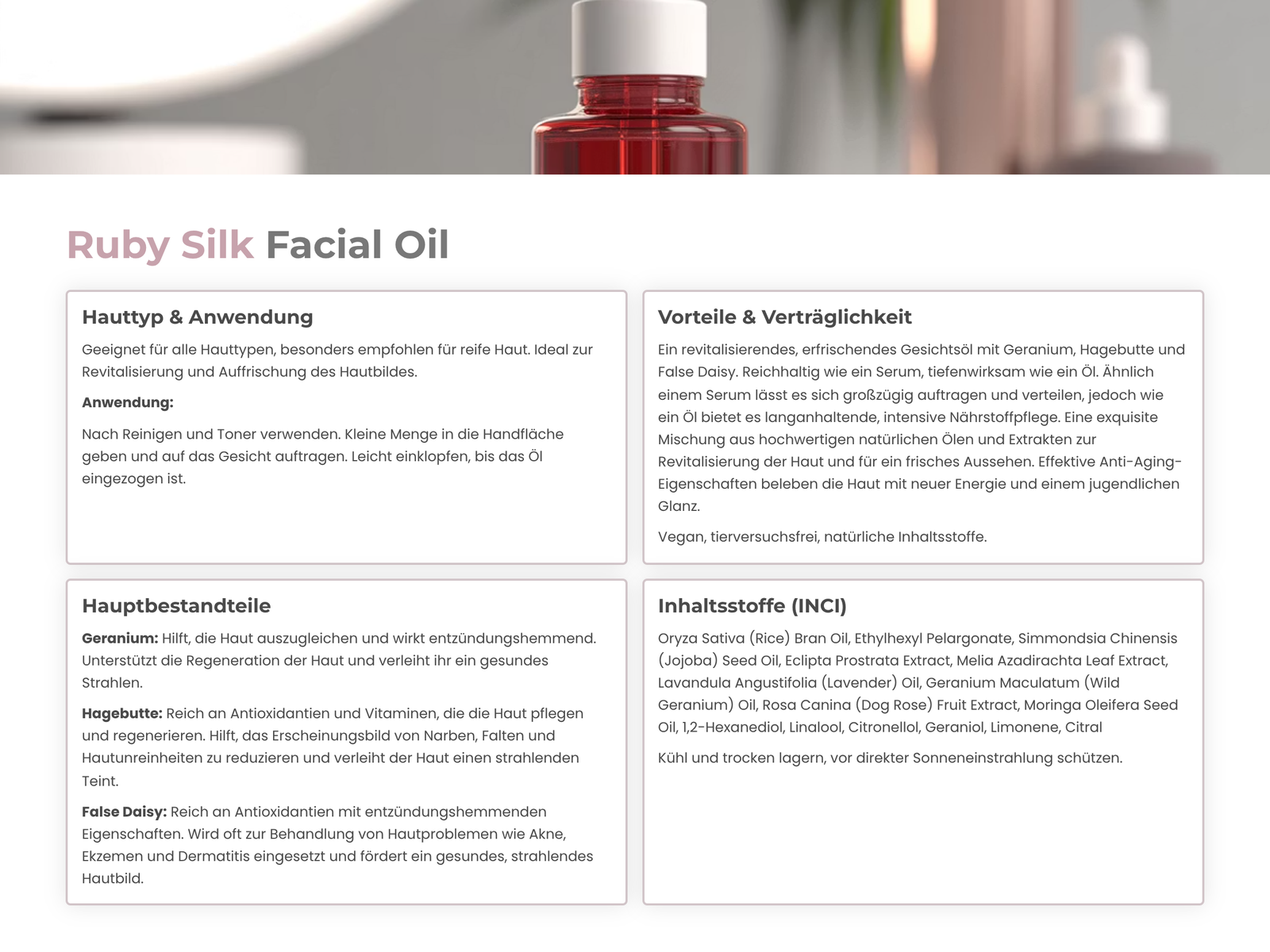 Das Ruby Silk Facial Oil ist eine exquisite Mischung aus hochwertigen natürlichen Ölen und Extrakten, die darauf abzielen, die Haut zu revitalisieren und ihr ein frisches Aussehen zu verleihen. Dieses Gesichtsöl ist perfekt für alle, die ihrer Hautpflegeroutine einen Hauch von Luxus und effektive Anti-Aging-Eigenschaften hinzufügen möchten. Reichhaltig wie ein Serum, tiefenwirksam wie ein Öl – ähnlich einem Serum lässt es sich großzügig auftragen und verteilen, jedoch wie ein Öl bietet es langanhaltende, intensive Nährstoffpflege. Die sorgfältig ausgewählten Inhaltsstoffe Geranium, Hagebutte und False Daisy beleben die Haut mit neuer Energie und einem jugendlichen Glanz.
